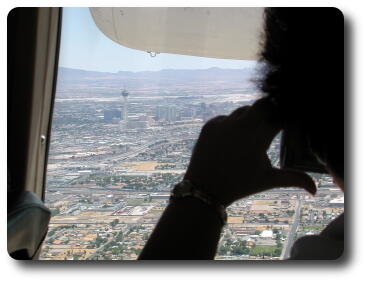 Looking out the right side of the plane I see the Stratosphere,