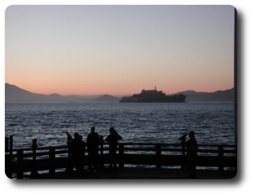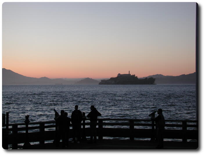 The island of Alcatraz, which looks a little like a naval vessel,