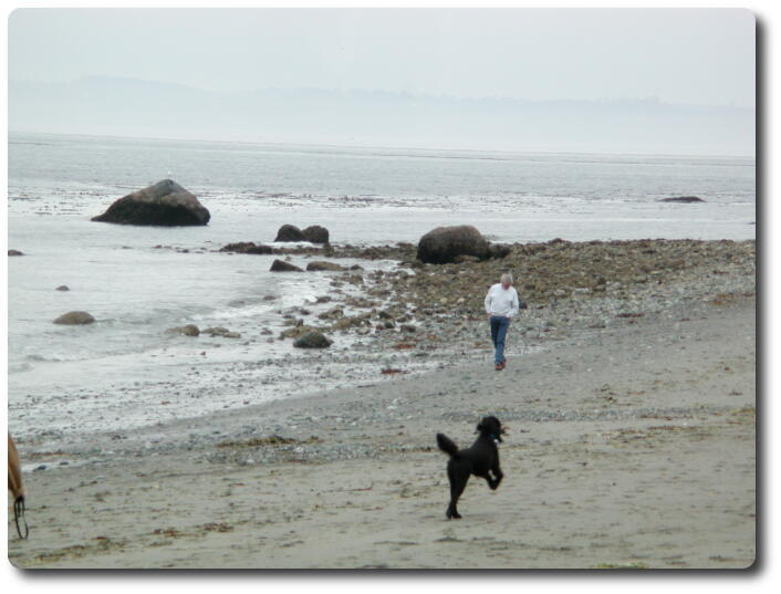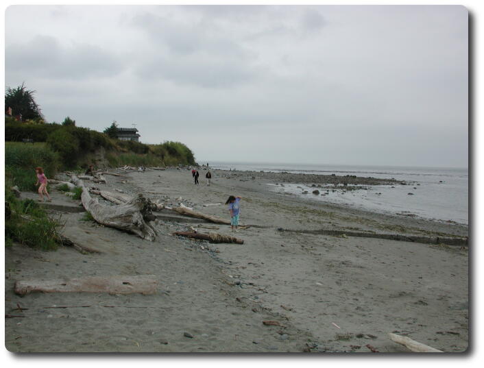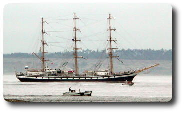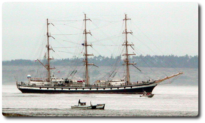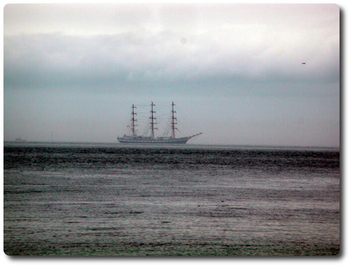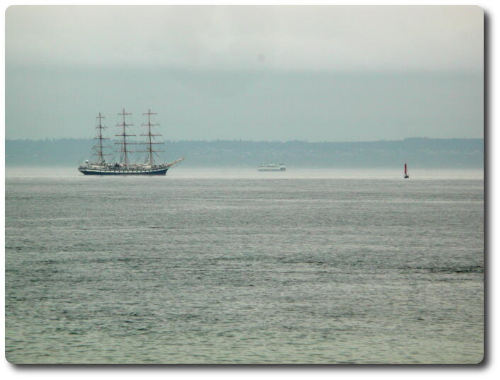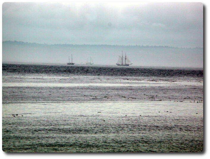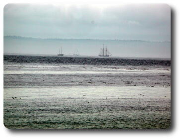 As it turns out, we happened to be there when the Tall Ships fleet was travelling from Victoria, BC to Tacoma. Entirely by accident, we ended up at the beach overlooking the Strait of Juan de Fuca, just as the ships were passing. And there were many cars parked there, so it seemed there must have been something to look at! And there was, although fog made them a little hard to see. Note: the following photos have been "enhanced". Basically the contrast has been stretched, and the colour balance changed. It was quite a foggy day, and the ships were only just visible in the original images.