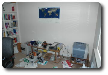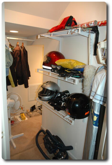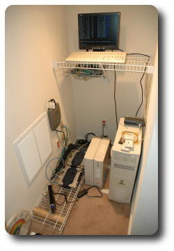 The rear of the closet was originally closed off, ending roughly where the step in the roof about the end of the shelves is located. I had it extended to make way for the computers and such things. The grill in the far wall goes to the back of the refrigerator and was for ventilation. There was a corresponding grill above the closet door. Most of the year it was fine, but needed a bit of assistance during summer.