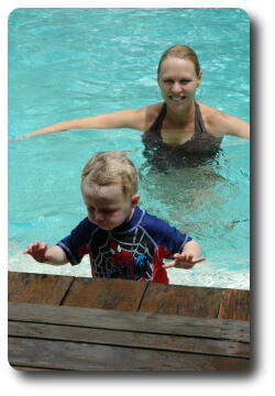 Jake in the pool with his mum, Michelle. Jake had swimming lessons