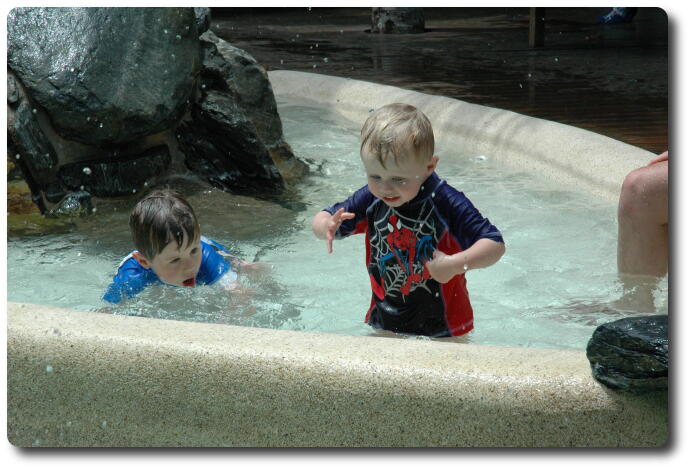 Jake and Flynn (and Cameron's knee) in the wading pool, splashing