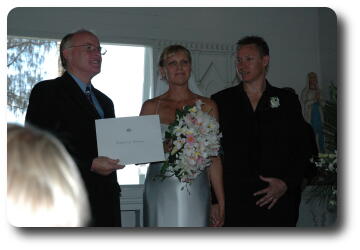The Marriage Certificate being presented to Mr. and Mrs. Wallace, as