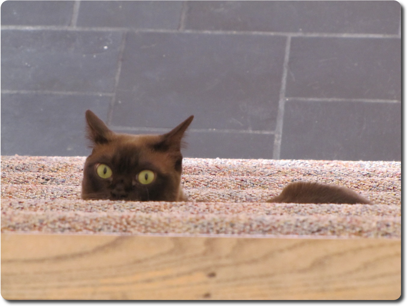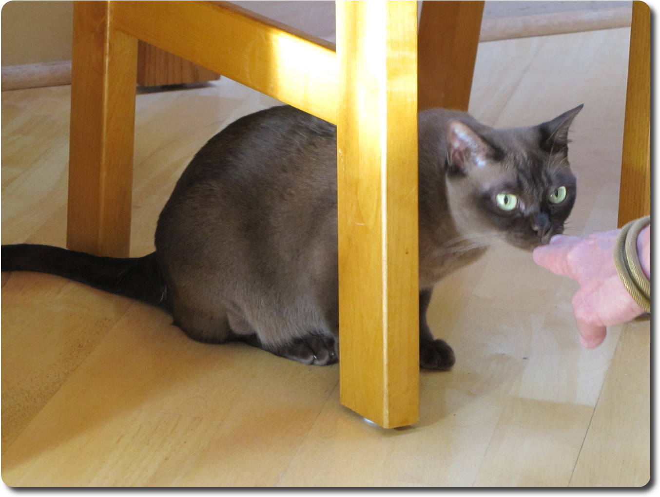 seen here under a kitchen table chair with Nancy trying to entice her out.