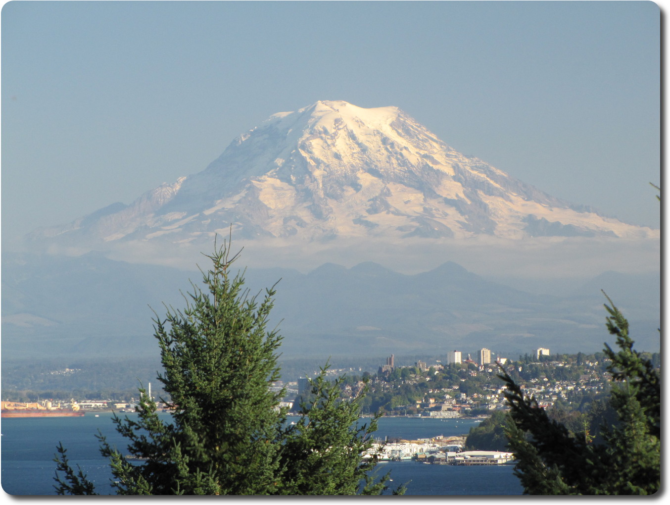 The tall buildings between the two trees are located in Tacoma.