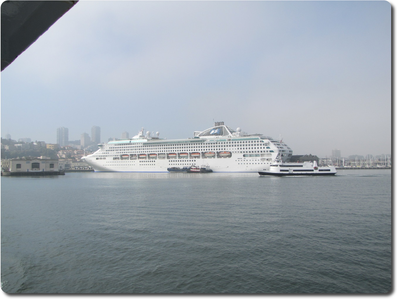cruise ship was docked several piers away from the Alcatraz Ferry
