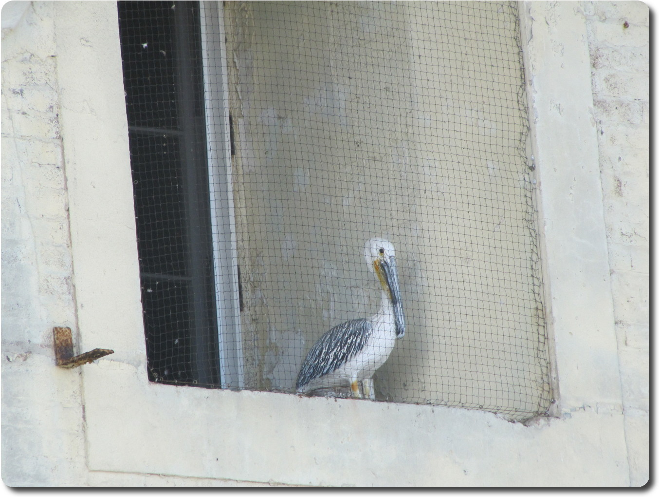 Perhaps this pelican (fake, and safely ensconced behind wire) is a