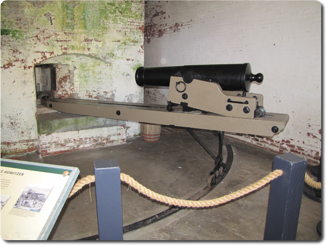 The howitzer shown here was the second line of defense, as explained on the display board visible in the lower left. It's job was to attack any invaders who landed and were approaching the fort.