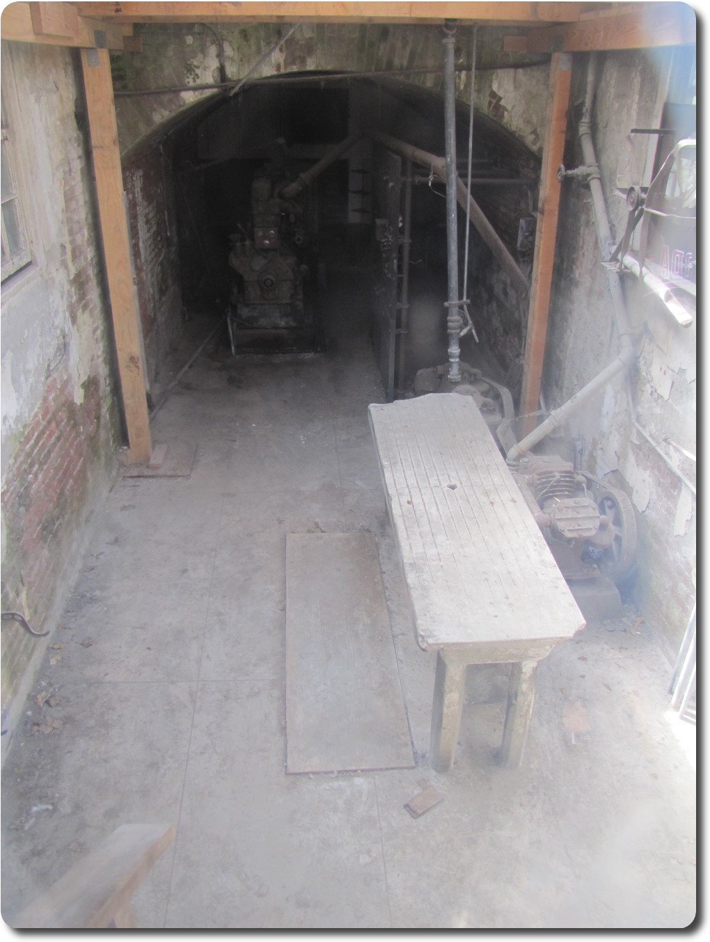 In 1934 Alcatraz became a federal penitentiary, and the morgue was no longer used. In that year an emeergency lighting system was installed inside this building (notice the generator and switch panel.) During this period, deceased inmates were buried at a local cemetery, if not claimed by family members.