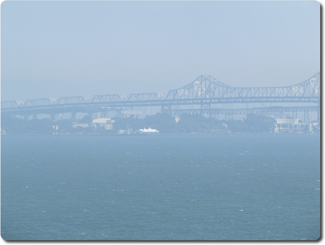 Oakland bridge. Two levels of traffic, one headed east, the other west.