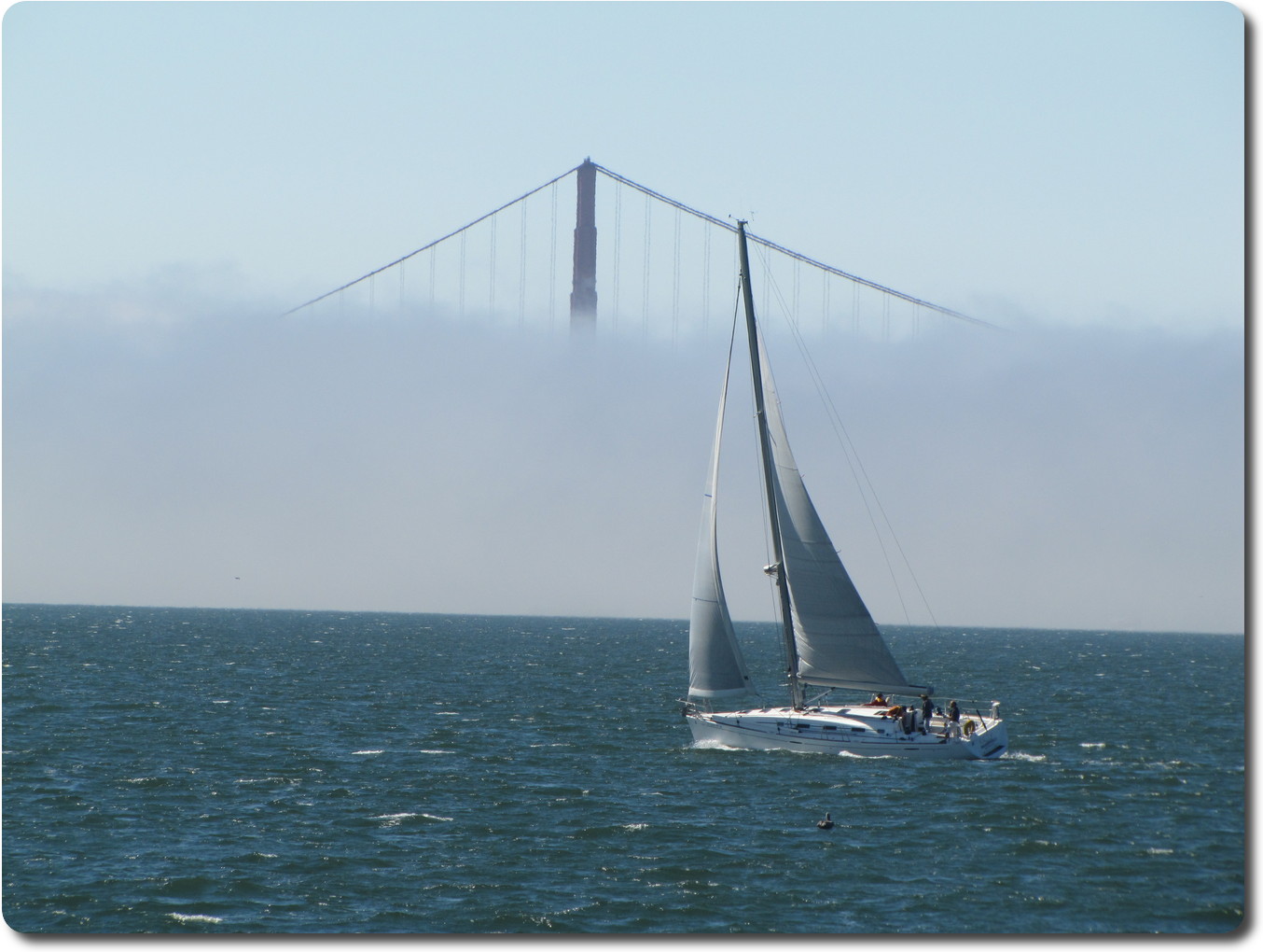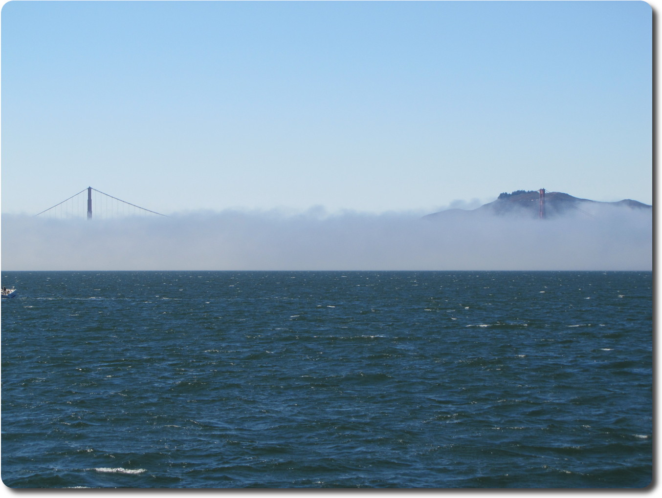 The Golden Gate bridge, though mostly covered in fog.