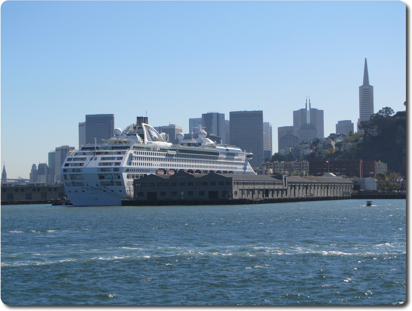is still docked, but the city skyline is not impaired by fog.