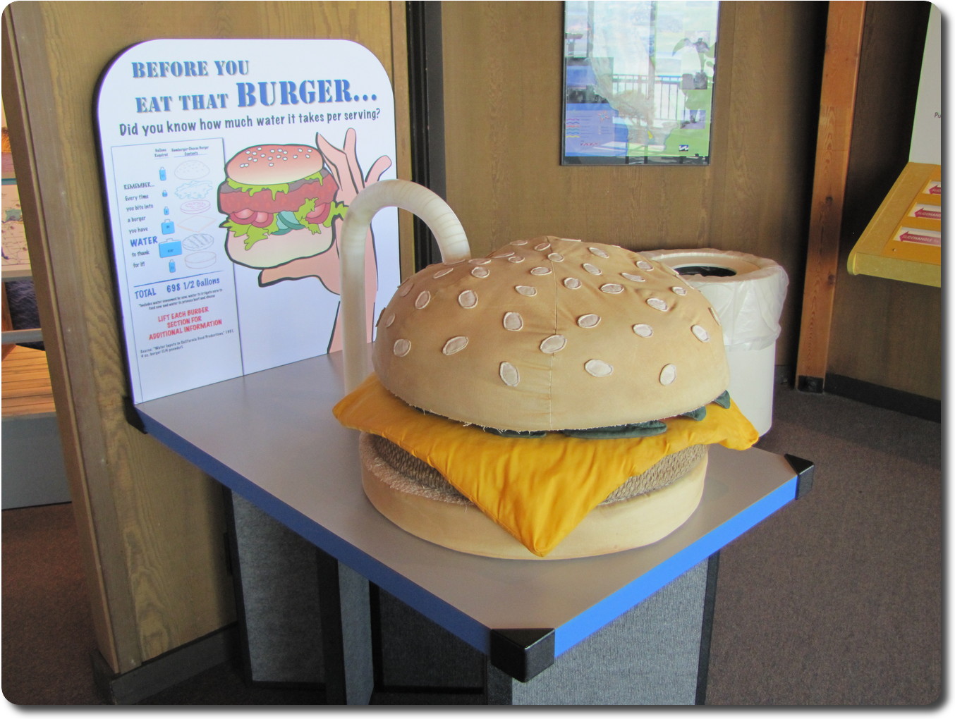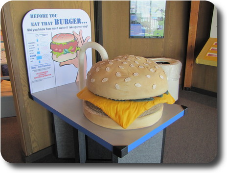 The above is a clever way of displaying how much water is consumed for the production of one quarter pound cheeseburger! That's a lot of water - 2600 litres, or almost 700 gallons of precious water.