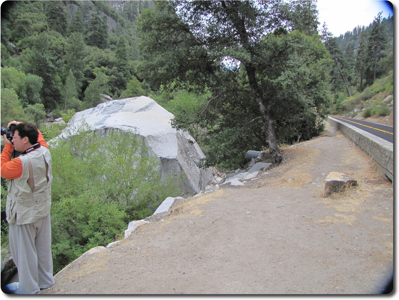 Jeffrey photographing the rock fall along the banks of the Merced River.