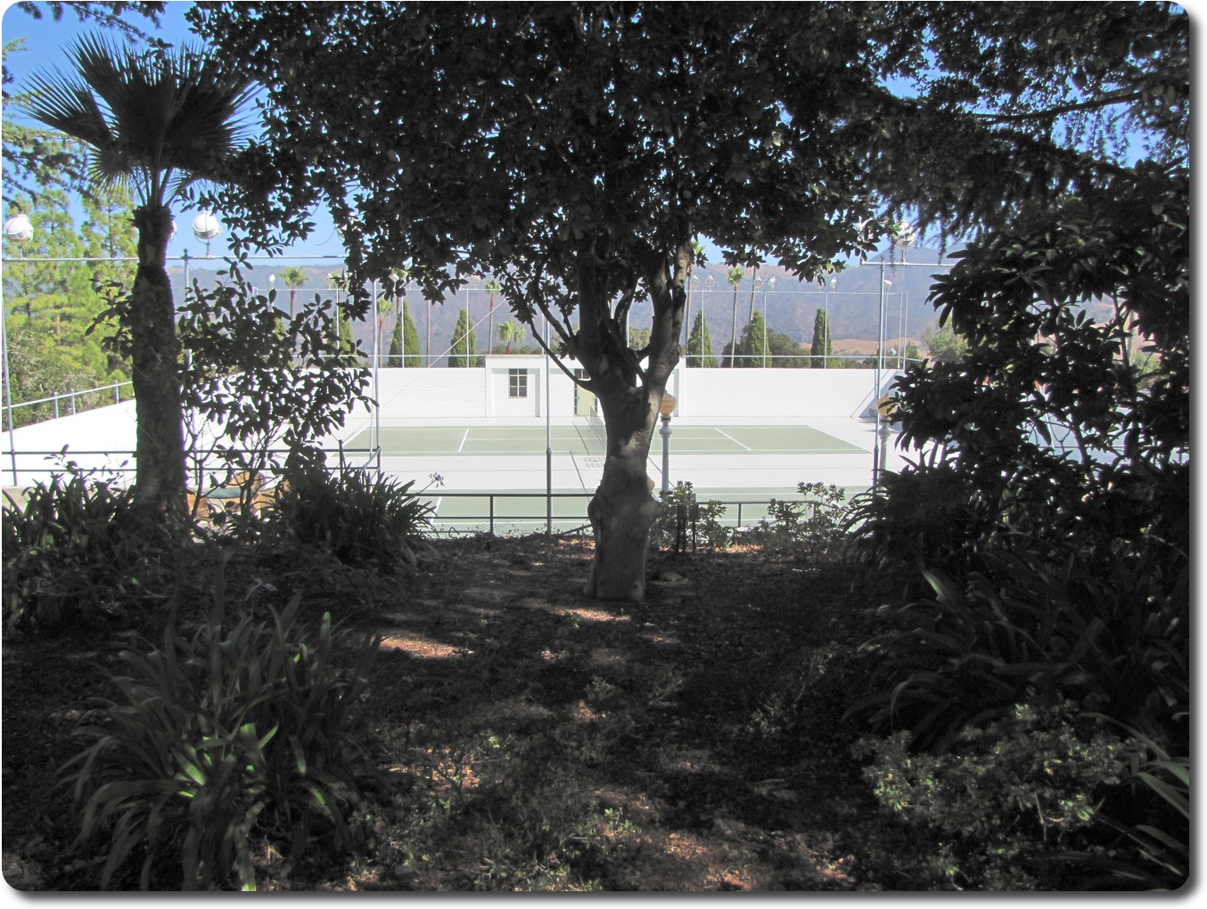The rear courtyard has a garden, beyond which are tennis courts, below which