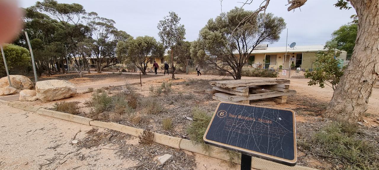 Cook was a service centre for railway workers. Facilities included a school and hospital. It is now a smaller facility for rail workers, including shift changes of train crews. The buildings in the background are accommodation for rail personnel.