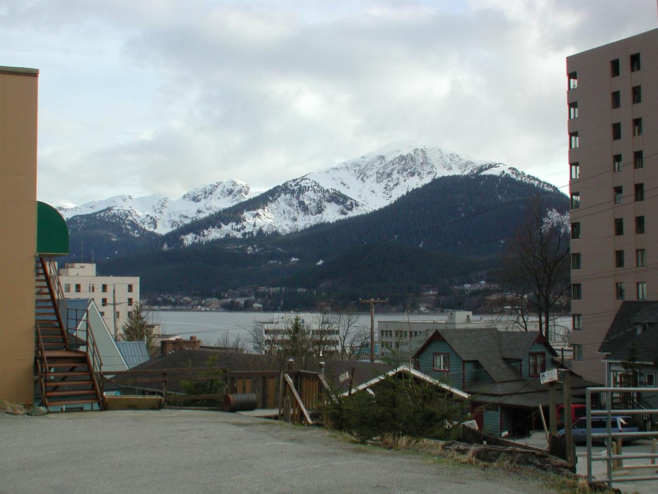Overlooking part of downtown towards the snow covered peaks on Douglas Island.