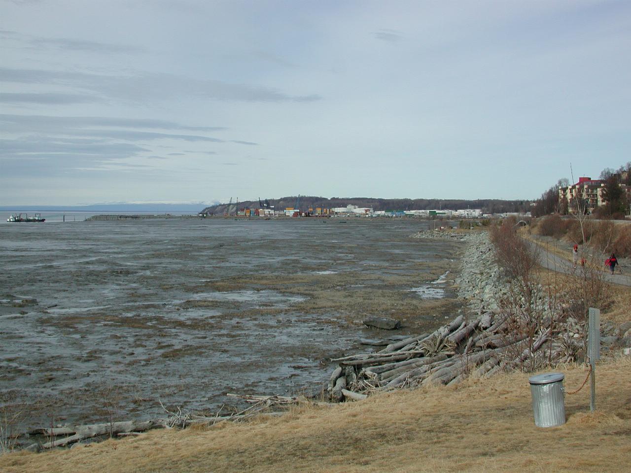 Very low tide on Cook Inlet. Ship Creek runs right to left, in front of the buildings in the distance.