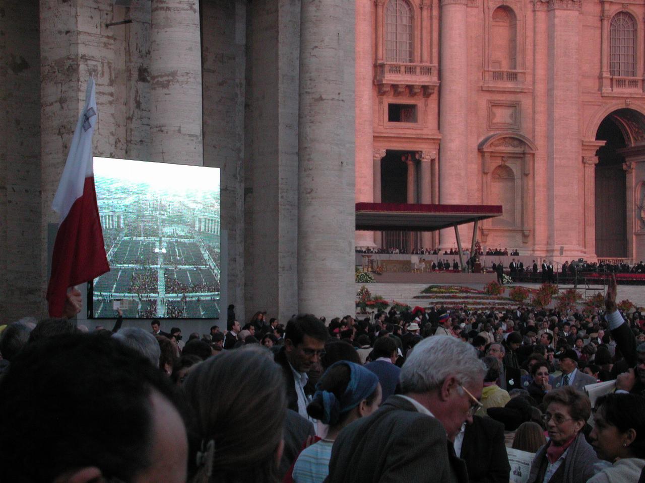 Looking from the area we staked out towards the front of St. Peter's Basilica, and the altar which is under the red fringed canopy. Note the pink tinge to St. Peter's from the early morning sun. Note also the large TV screen at the front of the colonnade.