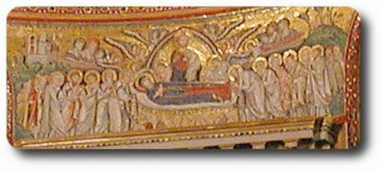 The lower part of the mosaic, showing Mary lying across the coffin.