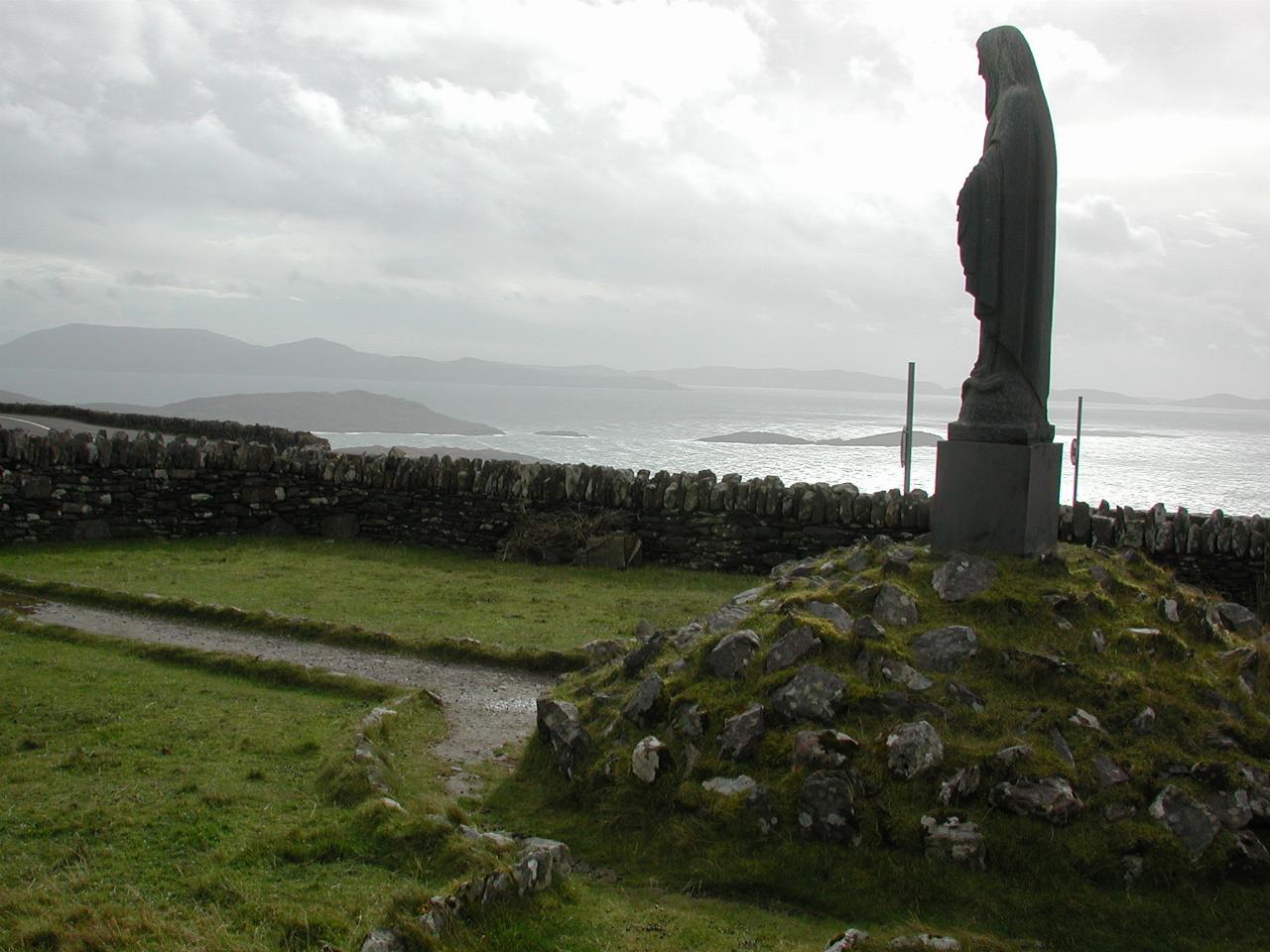 As was common in southern Ireland, there is a statue of Mary situated on the Pass. The islands behind are Deenish and Scariff, the further away and larger of the two.