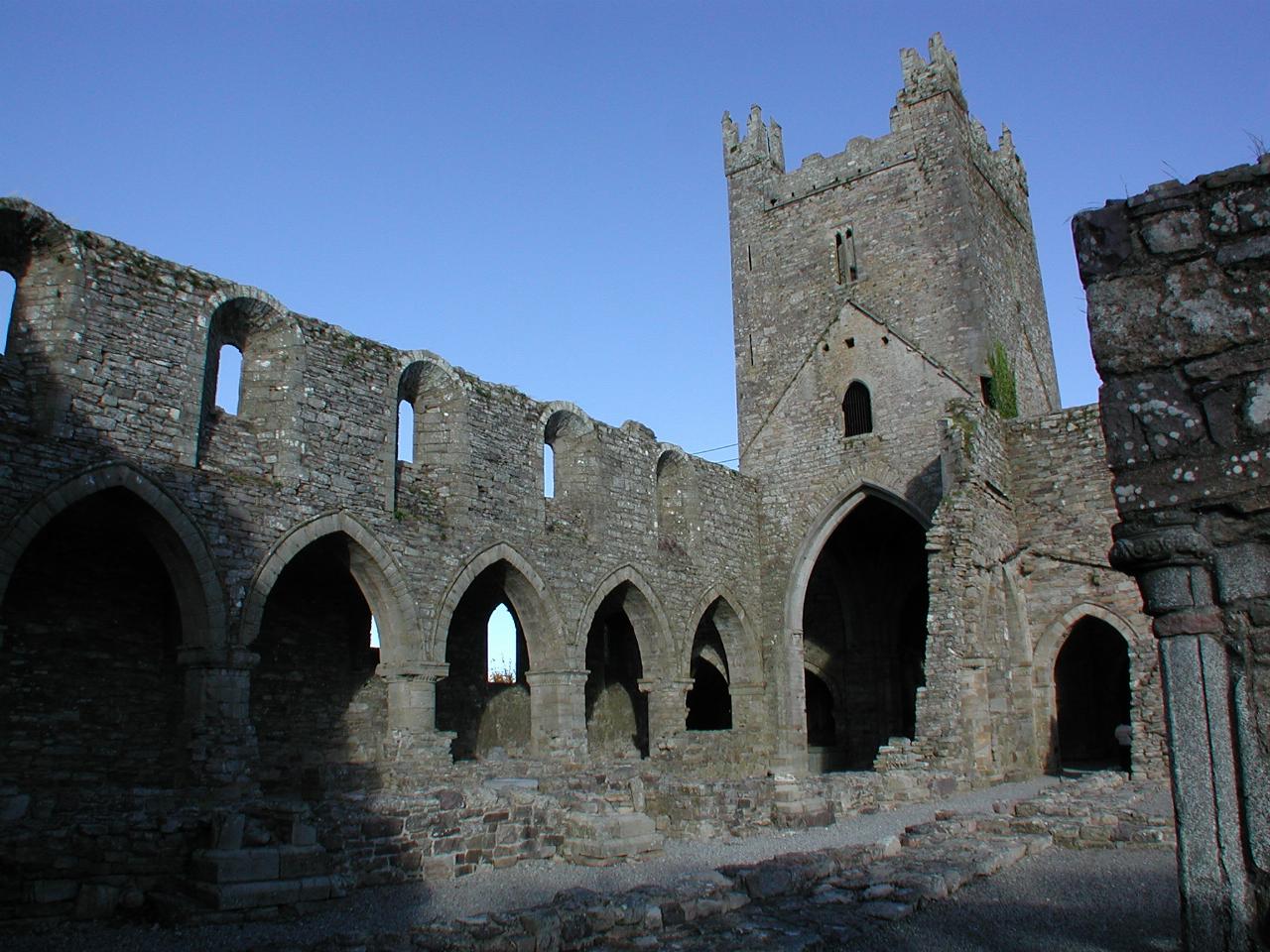 From one end of the cloister, showing the remaining church wall and tower.