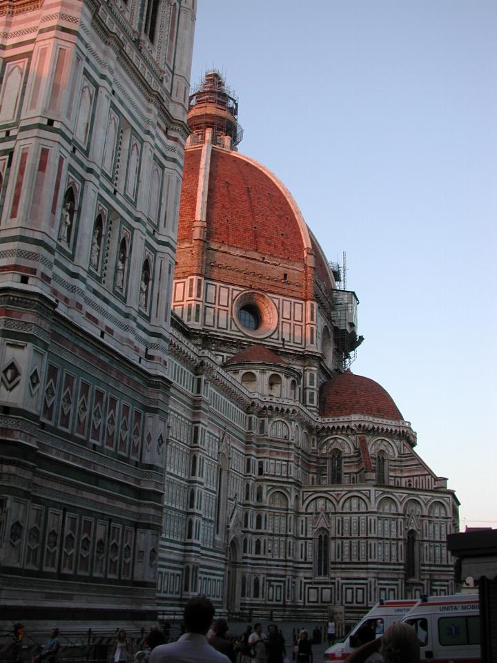 These photos show, at least partially, all 3 parts of The Duomo, which is actually The Cathedral of Santa Maria del Fiore. The Duomo refers to the dome. There's also the Campanile (bell tower) on the right side. It's not really obvious here, but the Campanile is a separate structure. The cathedral construction began in 1296 by Arnolfo di Cambio, whose charter was to "build the most beautiful and honorable church in Tuscany". He died in 1310, yet it took another 100 years to finish by Giotto, Pisano and Talenti. It is the fourth largest church in the world.