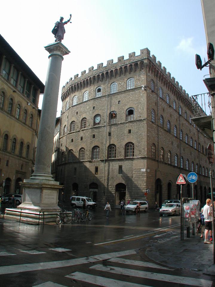 This is a pre-Renaissance building in the Piazza S. Trinita. The Column of Justice is on the left of the image and marks the spot where Medici Duke Cosimo I received news of victory in the battle of Montemurlo in 1537. The result stopped republicanism and cemented the duke's power. The column was given by Pope Pius IV in 1560, and came from the Baths of Caracalla in Rome via boat to Pisa then rollers from there.