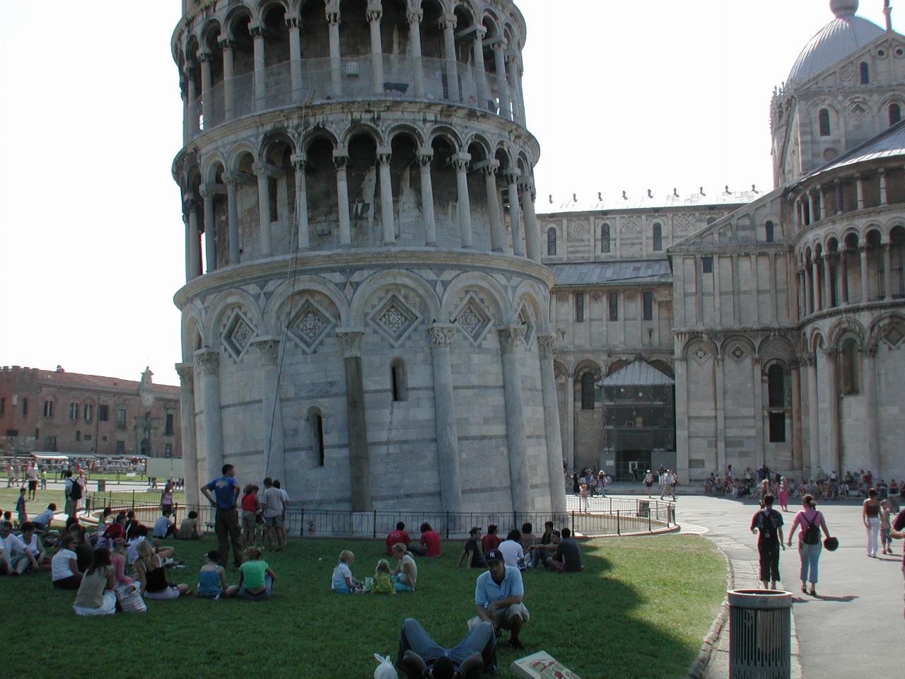 Pisa's main claim to fame is the leaning tower. Not that it was designed that way, but... Construction began in 1173, but was suspended after 10 years and at 3 stories due to the lean which was already visible! Another architect resumed building in 1275, but with a "kink" (still visible) to compensate for the lean. Construction stopped for a second time at 7 stories in 1284 due to excessive lean. The third building construction occured in the mid 1300s when the belfry was added, bringing the total height to 54 metres. Work is now underway to very slowly reduce the angle of lean, as it was threatening to tip over. The technique adopted is to very slowly remove soil from below the high side; the weight of the tower then equalises the soil and slowly the tower has been coming back to more vertical. The goal is to have as much lean as possible while ensuring the tower will not fall over. And the lean also puts extra load on the structure, which has been investigated only to discover that it has many voids, and so is not as strong as it might appear from the apparently solid exterior!
