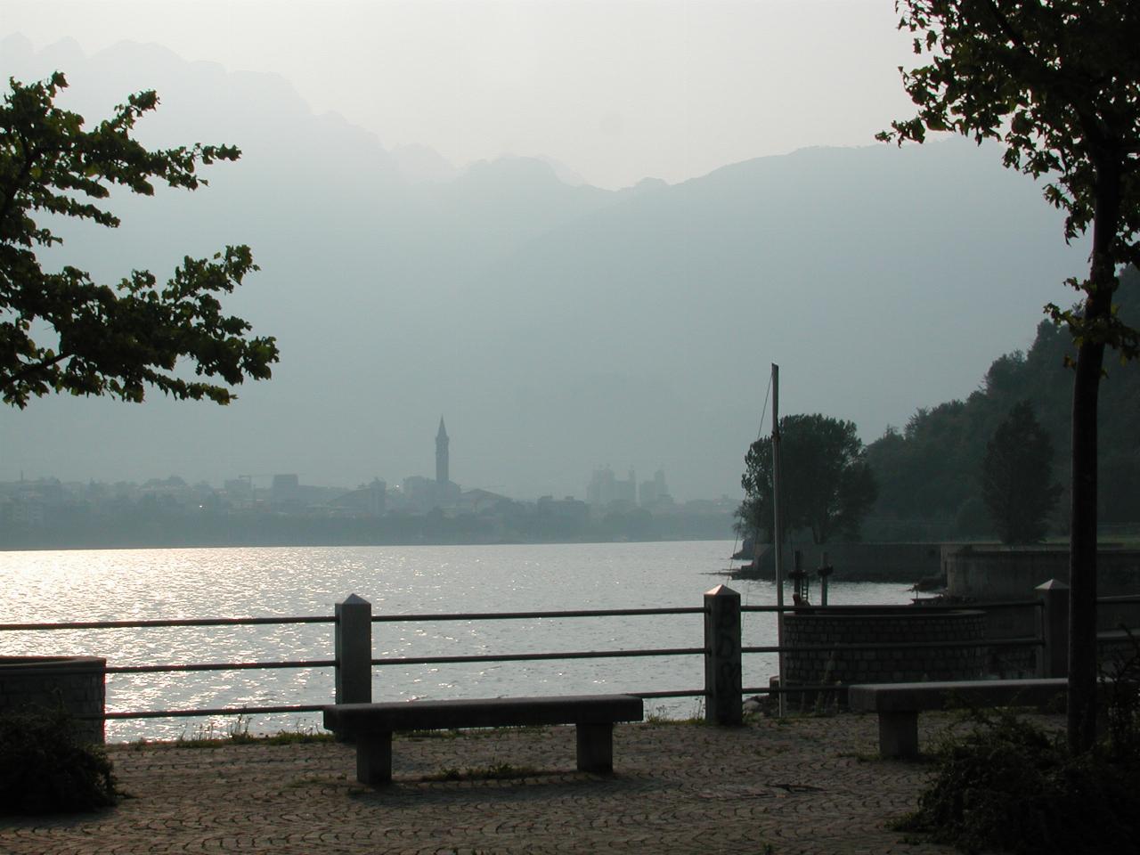 From about the same position, but looking more north, showing (well, not very clearly through the haze) the mountainous terrain north of Lecco. And that's why the freeway runs through the mountain - there was nowhere else to build it on the narrow strip of land at or near lake level, and mostly built upon anyway.