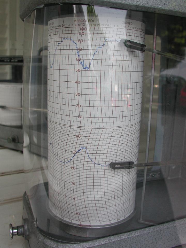 The other item is the hydrothermograph (recorder of temperature and humidity), located in the piazza near Hotel Splendide. the middle of the day, and the temperature reaching 33C (about 91F) around 2PM yesterday, dropping to 22C (about 72F) overnight. OK, that explains why it's somewhat uncomfortable!