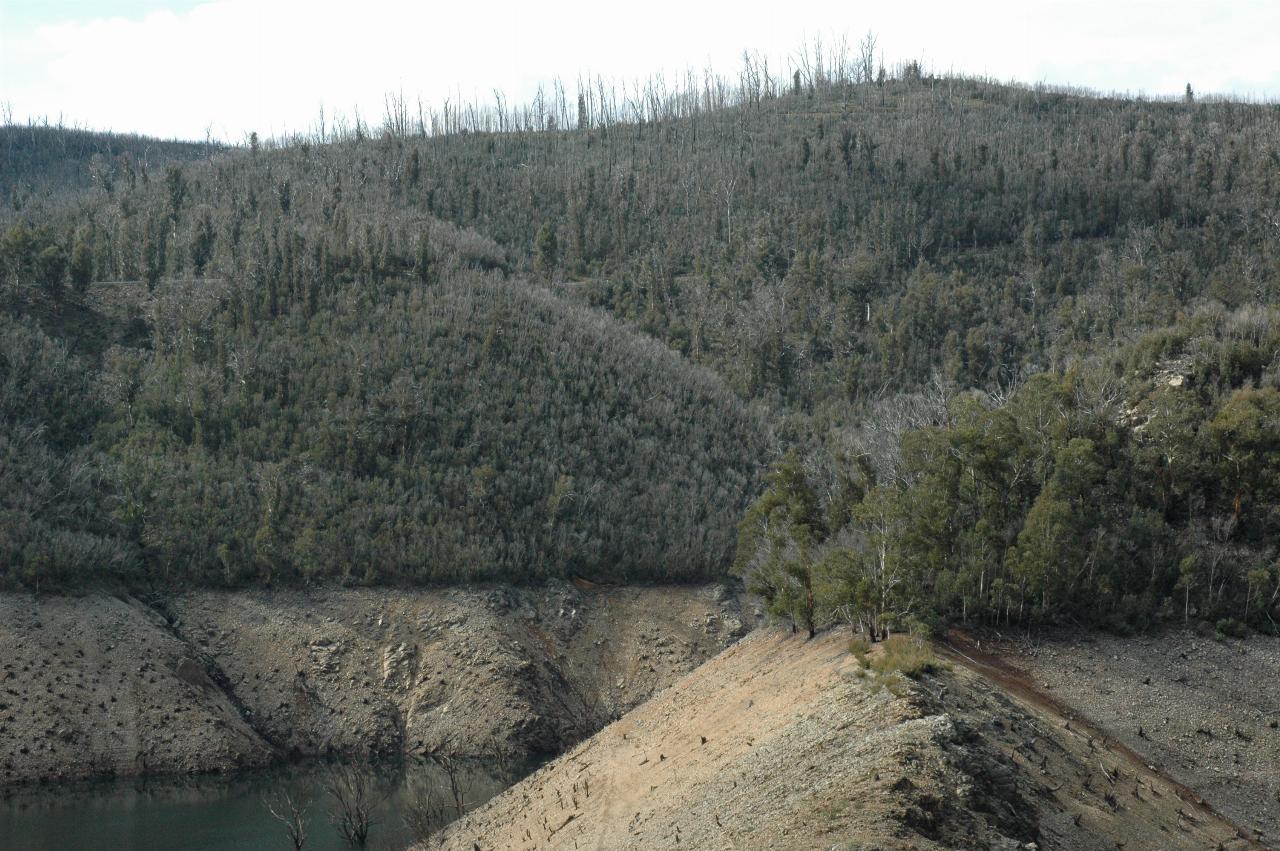 The other side of the dam, and the direction I was headed. Note the tree stumps from (I'm guessing) the 2003 fires - visible on the top of the ridge, but also down to the full water level. These eucalypts are mostly not snowgums, and so are covered in new shoots.
